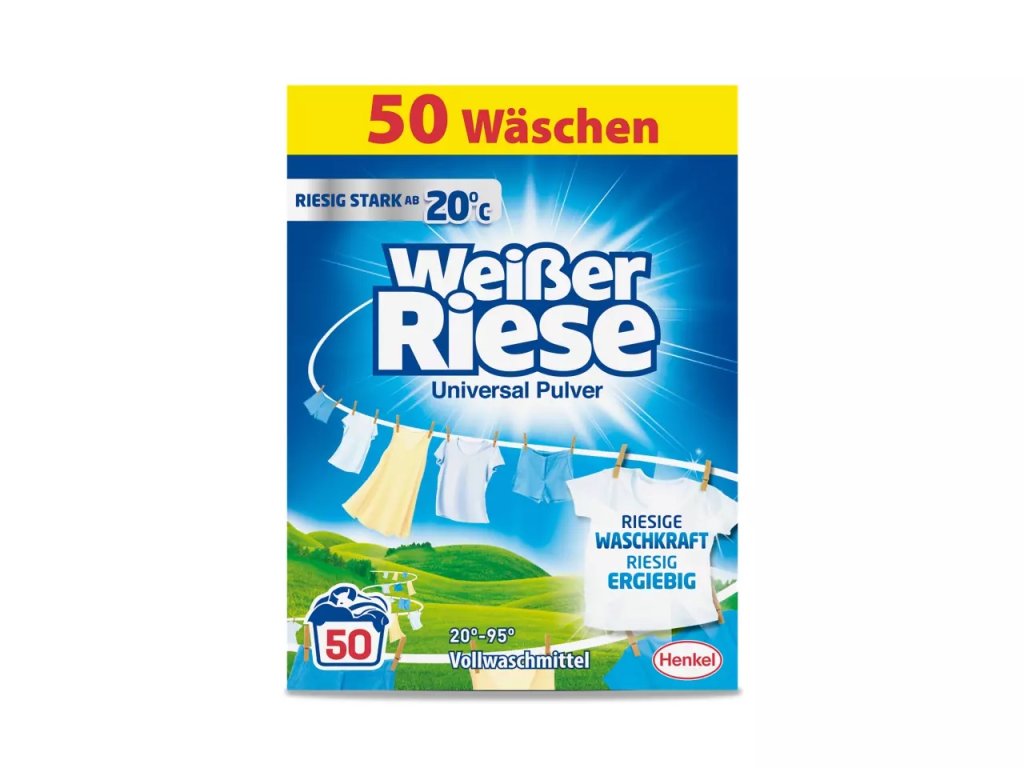 Weißer Riese univerzální prášek je díky své prací síle extra silný proti skvrnám, extra úsporný díky účinnosti praní již od 20°, zajistí zářivě čisté prádlo se svěží vůní. Obsahuje změkčovač vody, který pečuje o vaši pračku a zabraňuje usazování vodního kamene v jejích útrobách. Jedinečná technologie parfémování zajišťuje, že vaše zářivě čisté prádlo je nyní extra svěží – a to po celé týdny. Dodáváme ve velikosti balení 50, 90 a 120 pracích cyklů.